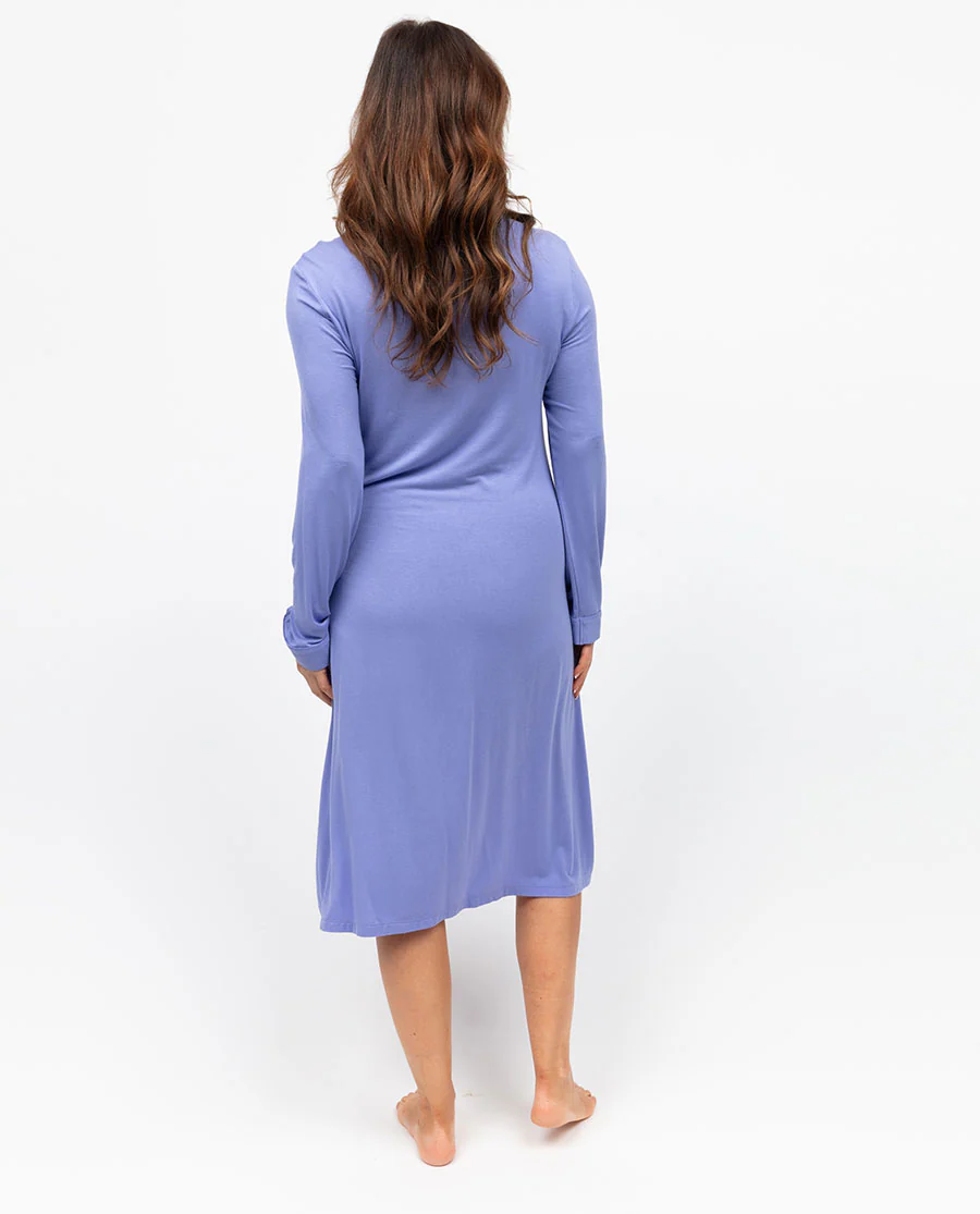 All sleepwear should be playful, desirable, and a welcome addition to your evening and morning routines. Our Angelina Lilac Lace-Detail Jersey Long Sleeve Short Nightdress is all that and more. Made from a soft blend of modal and elastane, this piece drapes effortlessly, moving with you as you stretch through your morning. Lilac all over, it falls into a flattering, easy silhouette that feels just as good as it looks. Towing the line between chic and perfect for unwinding perfectly, this piece was designed with graceful simplicity in mind. With a rounded back and V-shaped front neckline, a delicate geo semi-circular lace tracing the front, and gentle gathers for a touch of romantic detail. The long sleeves add just the right amount of coverage, while the self-folded hem ensures a flattering and flowing fit. Whether you’re curling up, stretching into the morning, or simply sinking into well-earned rest, this nightdress is there to wrap you in comfort.