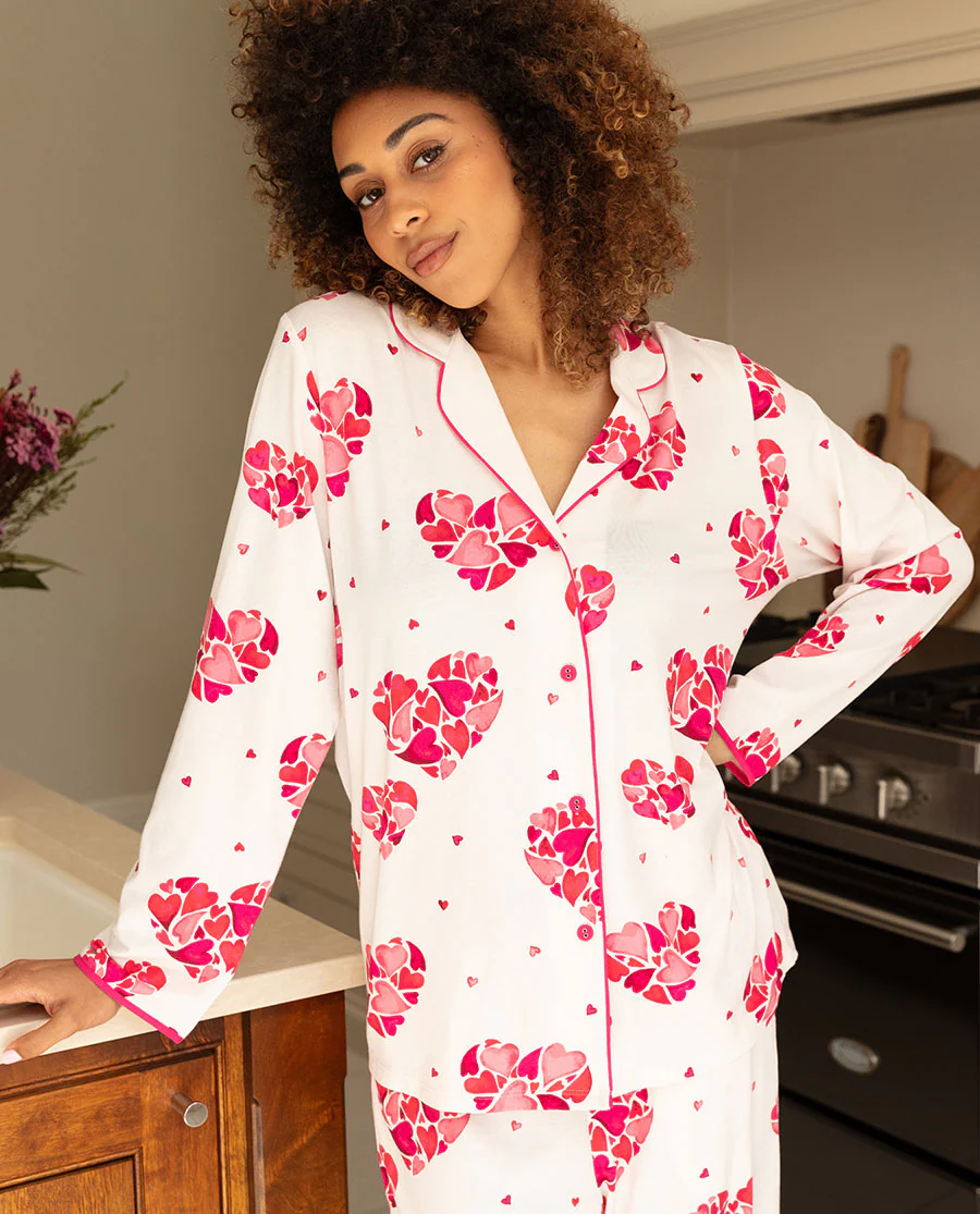 However you choose to indulge in the comfort of our romance-inspired Aria Womens White Mix Heart Printed Jersey Long Sleeve Pyjama Top you’re certain to look effortlessly stylish whilst doing so. Printed top to bottom in a pink and red heart pattern against a white background, and composed from a super-soft blend of 52% cotton, 41% modal, and 7% elastane, this pyjama top is set to be the perfect cocktail of serene comfort and style that you need for a restful night’s sleep. Trimmed with a bright pink modal along the revere collar, plackets, and sleeves, and featuring matching modal-covered buttons, this piece is adorned with luxury details for you to get lost in. You can also get this top as part of a set with matching pyjama bottoms, but it’s sure to match well with your existing pyjama wardrobe’s collection of bottoms and shorts too.