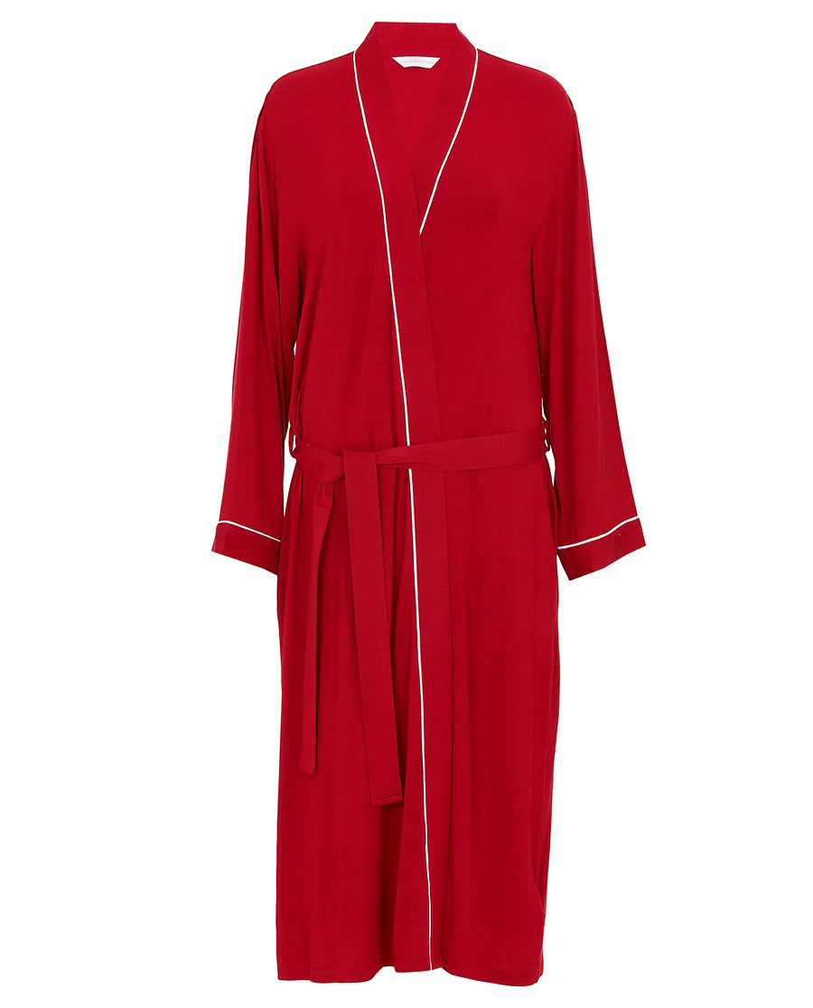 No plans, but something gentle to wrap yourself in? Sounds like enough of a plan to us. Our Blaze Red Jersey Long Dressing Gown is made for the slow, drawn-out hours. For evenings that start at 5pm and mornings that end at 1pm, when there’s nothing on the to do list and that sounds amazing. Cut from a soft-against-the-skin modal jersey, its kimono shape wraps and falls with just the right weight. With long sleeves, a wrap front, and a self fabric belt, think: built for big stretches on the sofa, and long mornings in bed. With inner satin ties and two side pockets making this dressing gown all things ease, you‘ll be turning midweek evenings into relaxation rituals. Let the day meet you on your terms, it’s always easier when we’re wrapped up in something cosy.