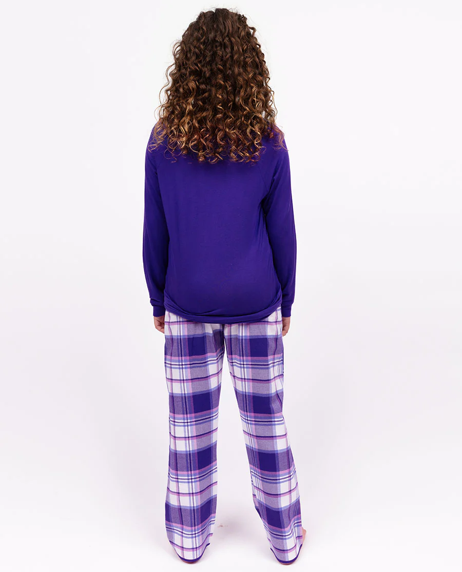 Because bedtime should feel like a soft exhale. Our Evolet Girls Purple Jersey Slouch Long Sleeve Top and Purple Mix Brushed Check Pyjama Set is made to help your little one wind down perfect for when comfort needs to take over. The long sleeve slouch top is crafted in a soft 95% modal & 5% elastane blend that's gentle against the skin and easy to move in, which is ideal for slow stretches before bed or lazy weekend mornings. A round neckline and straight hem give it a clean, relaxed shape, while self-fabric trims and a pink modal back neck tape add a sweet finishing touch. The brushed check pyjama bottoms bring a sense of cosy familiarity, made from a super-soft cotton-modal blend with a gently tapered leg. Rocking a purple on purple check print with an elasticated waistband and adjustable drawstring, they make getting the right fit simple, while side pockets add practicality they'll appreciate. Trimmed in complementary pink and purple modal, this set is perfect for evenings spent unwinding and mornings spent in bed a bit too long. There's even a matching women's version - because some things are better in twos.