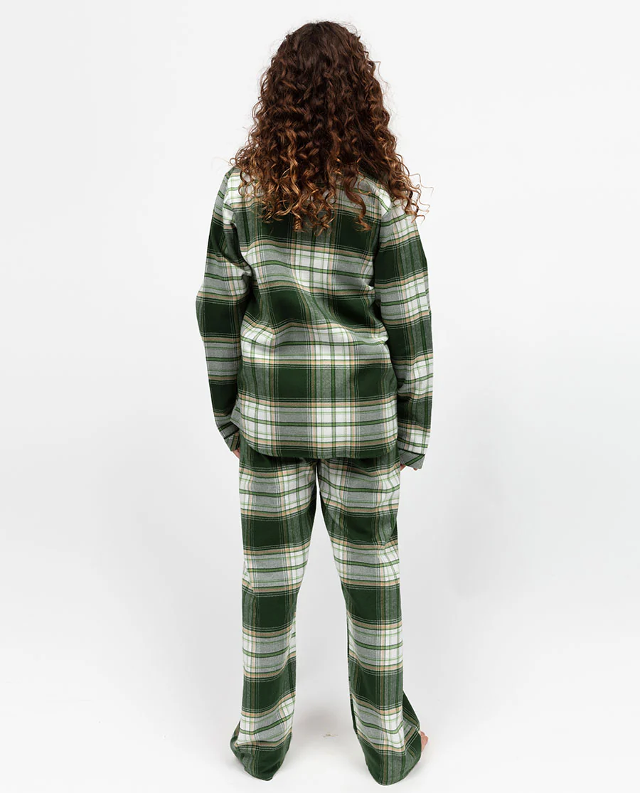 Pyjamas perfect for helping your little one fight off the chills and shivers of the winter, our Fern Kids Unisex Olive Green Mix Brushed Check Long Sleeve Pyjama Set is perfect for snuggling into. With its classic check pattern, this pyjama set is crafted from 100% super-soft brushed cotton. Designed to feel cosy for winter’s hibernation, it’s just right for layering them on cooler nights or big stretches in the morning. The heritage-inspired check is full of nostalgic comfort, accented with olive green modal for that classic pyjama finish. The top features a rounded one-piece collar, long cuffed sleeves, and a gently shaped bottom hem for a neat yet relaxed silhouette. Olive green buttons add a subtle contrast, completing the look with thoughtful detailing. The matching bottoms are built for comfort, with a fully elasticated waistband, an olive green twill tape drawstring for an adjustable fit, and two slanted side pockets perfect for little hands. Made to be worn with the family, this unisex set has matching pieces available in men's and women's sizes, making it the go-to choice for mornings spent together.