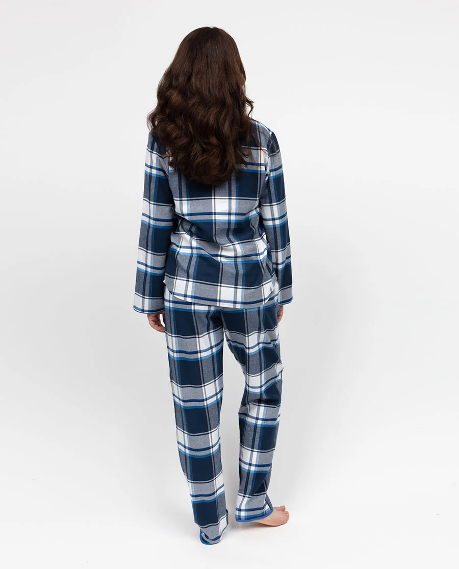 The kind of set that doesn’t spend much time in the laundry pile before you’ve raced to wear it again. The Frosty Brushed Check Pyjama Set brings together two cold-weather favourites: our soft-as-anything long sleeve top and straight-leg bottoms, both cut from 100% brushed cotton and finished with neat blue modal piping. The print? A navy mix check that combines classic patterns with modern styles. The top showcases a revere collar, shaped hem, and functional modal-covered buttons - a nod to your favourite blouses, just a lot more comfortable. The bottoms keep it easy with a flat front, elasticated back, adjustable tie, and side pockets for hands. Together, they make staying in feel like the best decision of the week. Add a hot drink, a slow morning, and a total lack of plans. Sounds like you’re good to go nowhere. Both pieces are available for individual purchase, letting you mix and match styles as you wish.