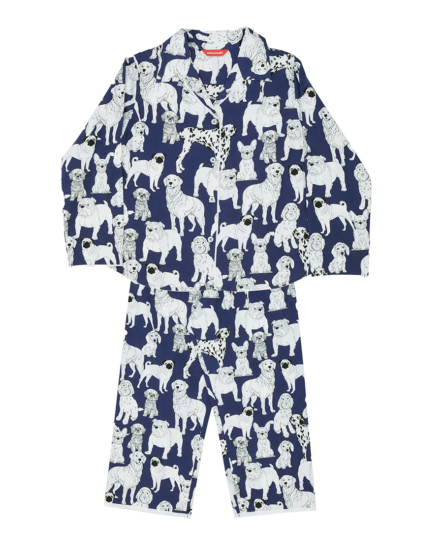 Morning stretches, bedtime cuddles, and afternoons spent in the sofa fort are all made comfier when your little one’s clad in our Indigo Girls Dog Print Pyjama Set. Cut from a soft and breathable blend of 60% cotton and 40% modal, not only does this long sleeved top and tailored trouser set feel gentle on the skin but it also gives your little one plenty of room to move as they wind down. Featuring a parade of cheerful white dogs prancing across a navy canvas, this pyjama set is finished with a crisp white modal piping, white buttons, and a matching twill drawstring to keep the fit of the bottoms neat. The top’s one-piece pointed collar is a charming touch, while two side pockets on the bottoms give tiny hands a place to tuck themselves in. Soft, playful, and endlessly comfy, this set is perfect for dream-filled nights and mornings spent slowly. Plus, we also have matching women’s sizes to make bedtime unwinds spent together even more special.”
