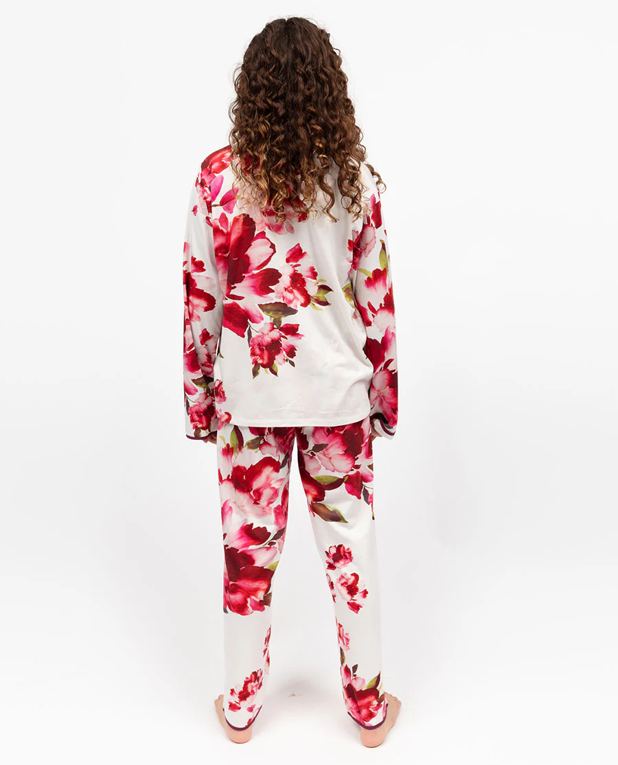 From curling up for bedtime stories to lazy weekend mornings spent in blanket forts, the Isabella Girls Ox Blood Mix Floral Printed Jersey Long Sleeve Pyjama Set is designed for the sweetest kind of slow-down. Made from a soft blend of 52% cotton, 41% modal, and 7% elastane for a hint of stretch, this breathable jersey set wraps your little one in comfort while allowing plenty of room to move and play. The floral print brings a touch of charm whilst a rich oxblood modal piping makes for a cosy, autumnal finish. Thoughtful details are what make all the difference, like the classic revere collar, softly shaped bottom hem, and functional oxblood red buttons, all stitched with care for that extra-special touch. The matching bottoms are made for comfort, featuring a flat front with a gently elasticated back, an adjustable drawstring for the perfect fit, and two slanted side pockets. With matching women's pieces available, this pyjama set is perfect for twinning in style and turning everyday routines into moments worth savouring.