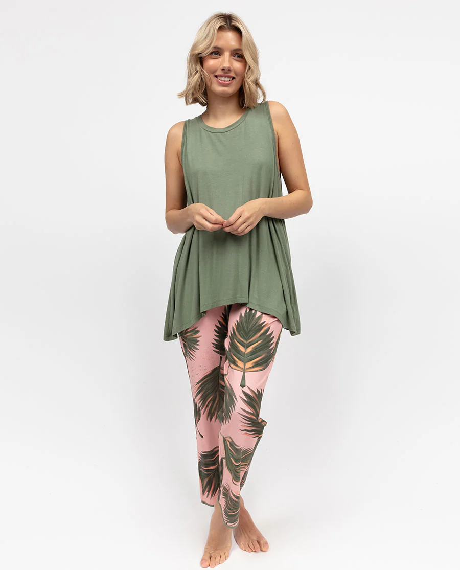 Look forward to relaxing in style after those long days with the cosy stylings of the Lea Womens Sage Green Jersey Relaxed Vest. A gorgeous sage green colour and a beautifully soft fabric composition of 95% modal and 5% elastane for a hint of stretch, this vest is perfect for unwinding in style. With a round front and slightly curved back neck showcasing a self-fabric trim, this piece falls to a flattering and relaxed silhouette that’s finished with a straight bottom hem. This piece is also available as part of a set with our Lea Womens Salmon Pink Mix Leaf Printed Jersey Pyjama Bottoms for a coordinated set that adds a pop of colour, but will match just as well with whatever pieces make up your existing nighttime wardrobe.