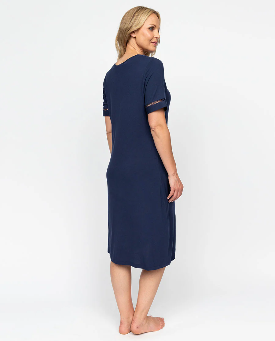 Keep cool as the early evening sun sets and relax before you fully get ready for the day with the comfy stylings of our Louisa Navy Lace-Detail Jersey Short Sleeve Short Nightdress. Crafted entirely from a navy blend of 95% modal and 5% elastane, this jersey nightdress is perfect for keeping comfy as you unwind in the evening. With a rounded back, a V-shaped front neck, and a self folded bottom hem, this nightdress creates a generous and flattering silhouette that lets you look effortlessly graceful in the evenings. With short sleeves and delicate insert lace along the neckline and sleeves, this piece is perfect both in those warmer summer evenings and for wrapping up warm under a blanket in the colder months. Layering well with a dressing gown or worn standalone, this piece is the comfy and stylish addition to your evening wardrobe that you’ll find yourself coming back to again and again.