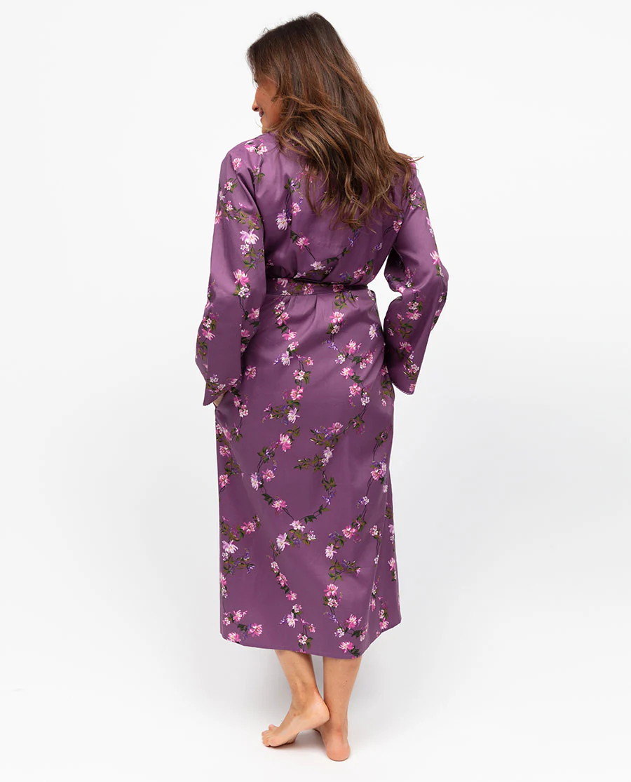 Soft, weightless, and made for slow, stretch-filled mornings, the Rhea Mauve Mix Lace-Detail Floral Print Long Sleeve Long Dressing Gown is the kind of layer you slip into to forget the outside world exists. Cut from a beautifully soft blend of 60% cotton and 40% modal, this dressing gown has that perfect barely-there feel that your freshly-showered skin looks forward to. With a print of flower chains against a rich Mauve fabric and a delicate insert lace trim, bringing that everyday romance to your evenings is easy. The kimono-style silhouette drapes beautifully, and, cinched at the waist with a self-fabric belt and inner satin ties, it ensures a fit that’s both secure and comfortable. Deep side pockets keep everything practical, and the self-folded hem gives a sleek finish. For slow mornings, quiet evenings, and the in-between moments where you get to pause, this is your invitation to slip into softness and stay there.
