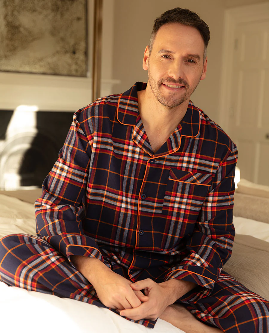 Pop open a bottle of classic comfort and timeless style with our Taylor Men's Navy Mix Lightly Brushed Check Long Sleeve Pyjama Top. Crafted from super-soft 100% cotton, this top wraps you in a veil of luxurious cosiness. The traditional blue, red, and white check pattern is lightly brushed for extra softness, and exudes a timeless charm from every direction. Enhanced with vibrant orange modal trim, this top boasts sophisticated detailing. Featuring long sleeves, a rounded collar, and a single chest pocket, the button front fastening pyjama top epitomises classic style. Complete with a shaped bottom hem, the top pairs effortlessly with the matching bottoms for a coordinated ensemble or mix and match with the other pyjama tops in our complete range.